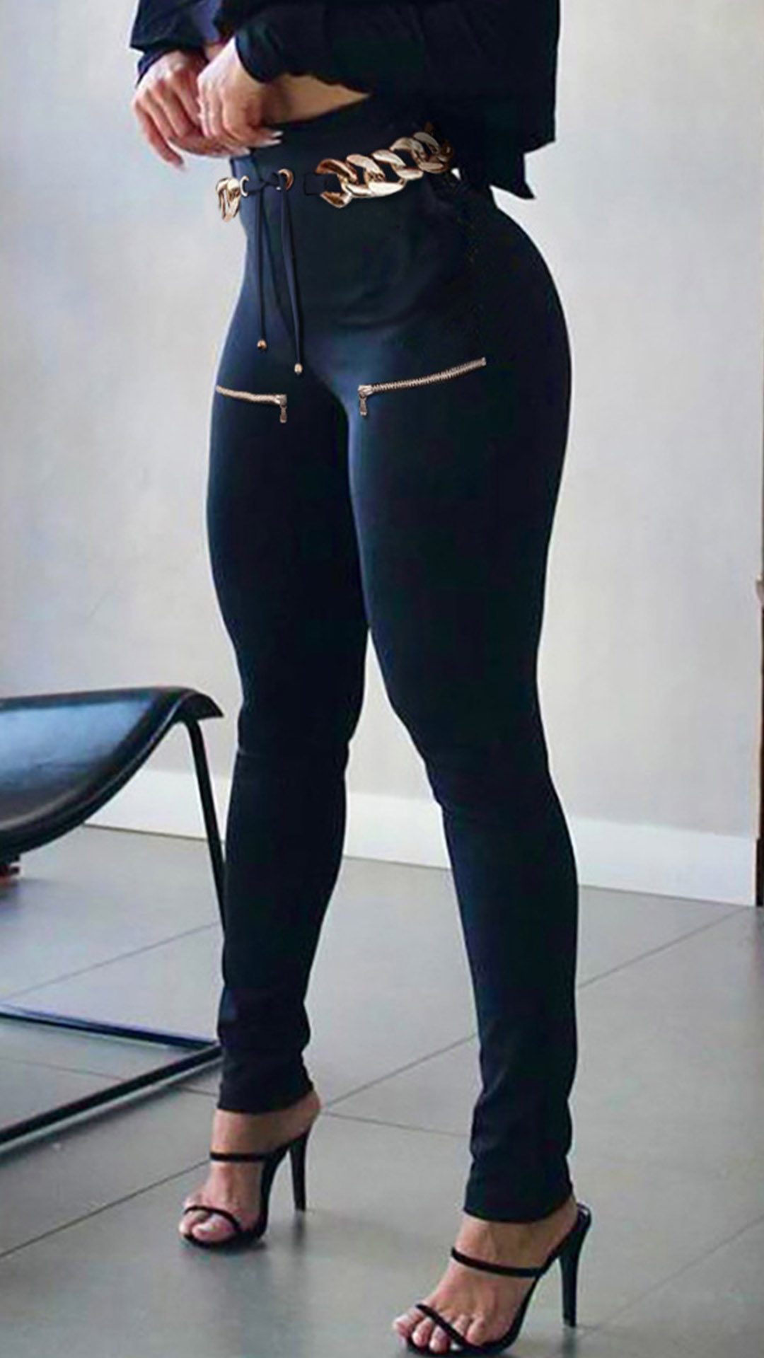 This is a fashionable pair of skinny pants with a high-rise waistline and a unique chain detail. It is made of a comfortable and stretchy fabric that accentuates the figure, while the chain adds an edgy and stylish touch to the overall design.