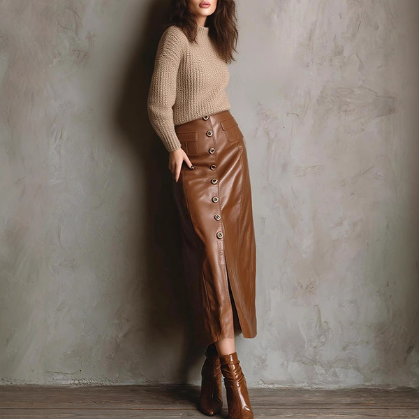 This edgy statement skirt brings contemporary boldness with structured sophistication. The high-rise waistline creates flattering silhouette definition and elongated proportions, while the artificial leather PU material adds modern luxe texture with sleek visual appeal. The front button and slit detailing provides add vertical design interest. The high-rise cut pairs beautifully with tucked-in tops and cropped styles. Wanna have a try?