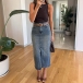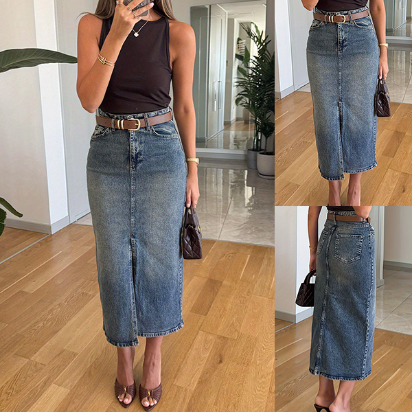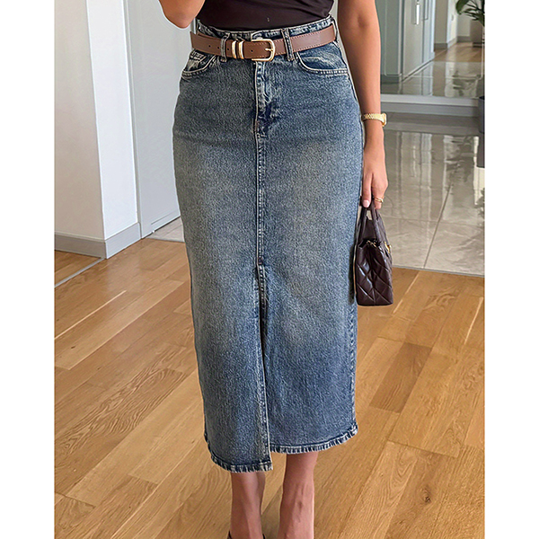 Elevate your casual style with this Denim Skirt. This trendy skirt features a flattering high-rise and front slit adds a stylish touch and enhances movement. Pair it with a graphic tee or a fitted blouse for a chic, effortless look.