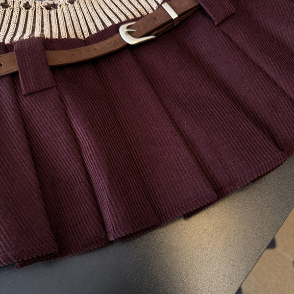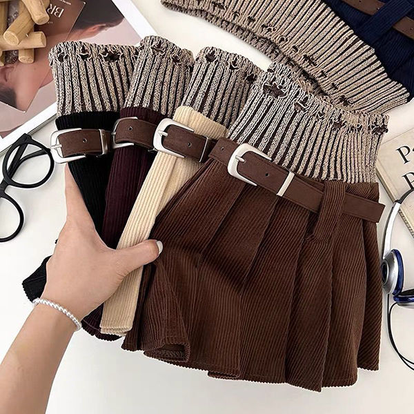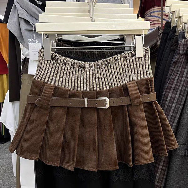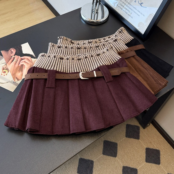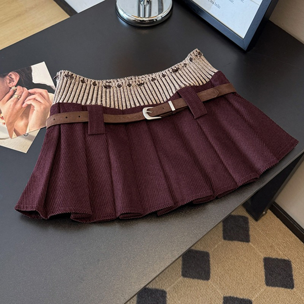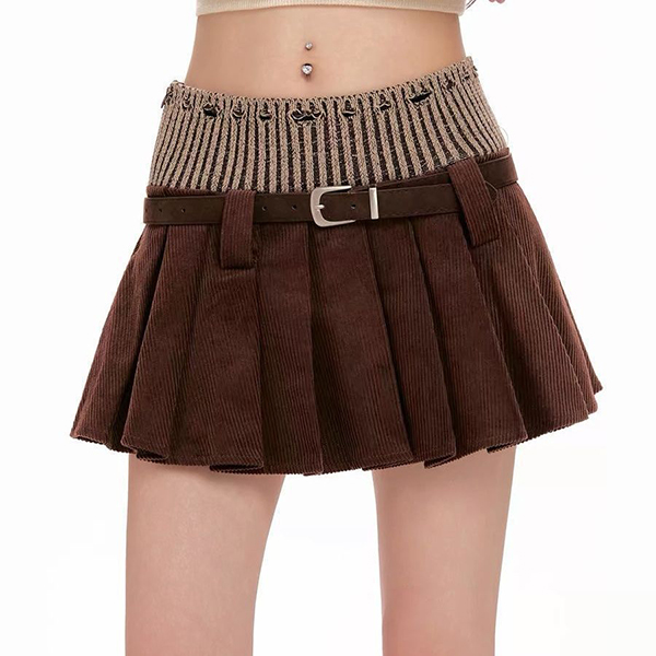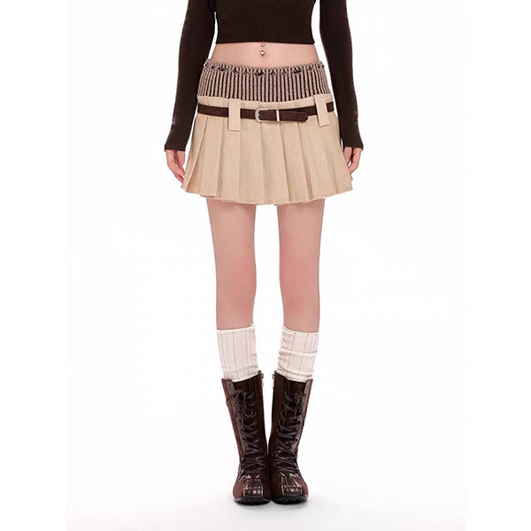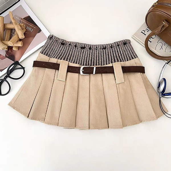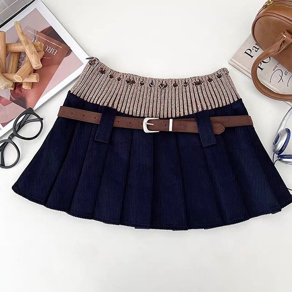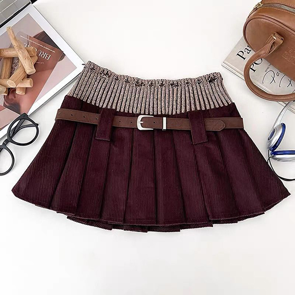 Fashion High-rise Knitted Spliced Pleated Skirt with Belt