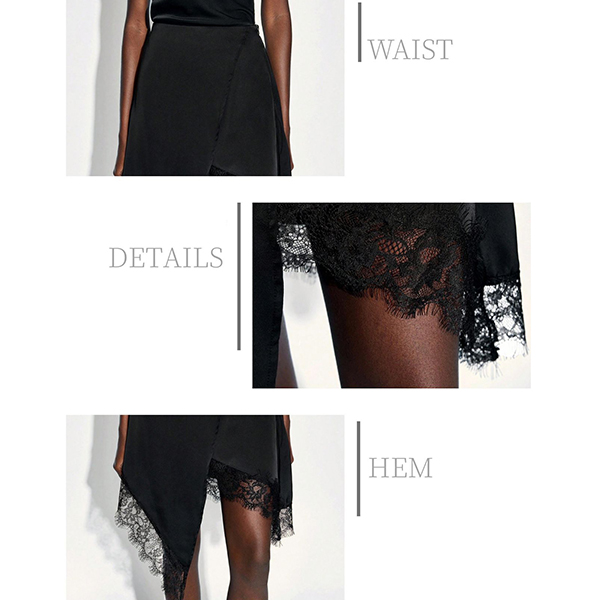 Look at this skirt~ Delicate lace splicing adds luxurious texture and vintage-inspired charm, creating eye-catching contrast and dimensional interest. And the irregular hemline brings contemporary edge and dynamic movement, transforming this skirt from traditional to fashion-forward. Pair with a silky camisole and heels for evening glamour, or style with a fitted sweater and ankle boots for chic daytime appeal.