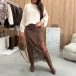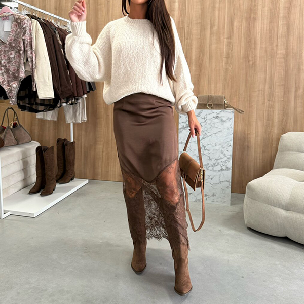 This elegant skirt features flattering high-rise waistline with delicate lace spliced detailing for contemporary feminine sophistication. Pair with fitted tops and heels for sophisticated feminine appeal.
