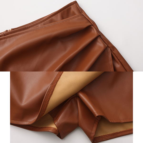 Add an edgy flair to your outfit with this Artificial Leather PU Skorts. This modern piece combines the style of a skirt with the comfort of shorts, featuring a flattering high-rise design and ruched detailing for a chic look. Wanna have a try?