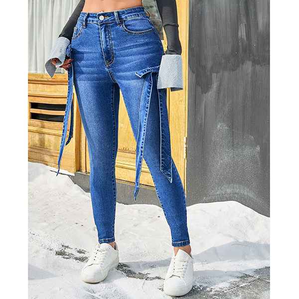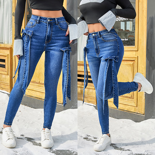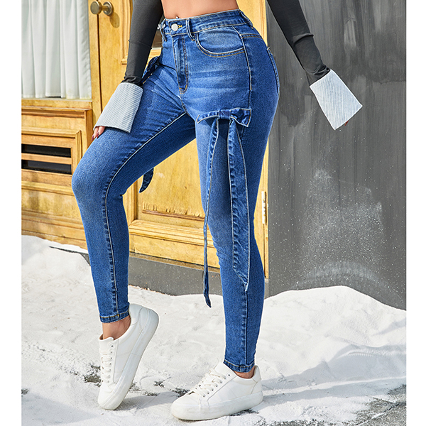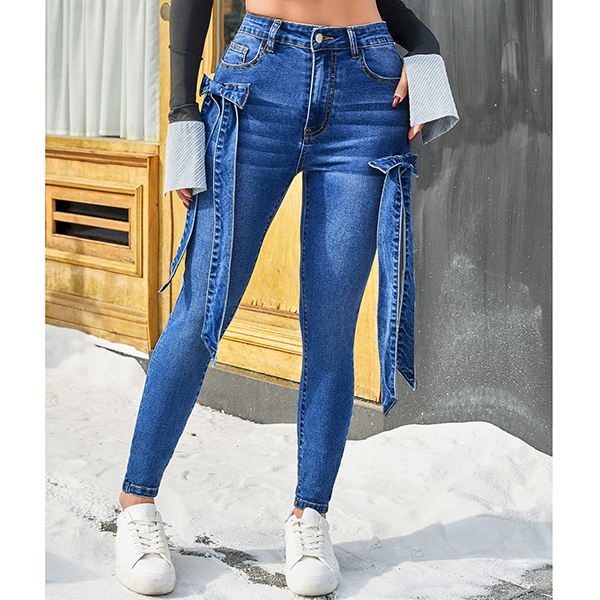 Fashion High-rise Side Bowknot Old-washed Skinny Jeans