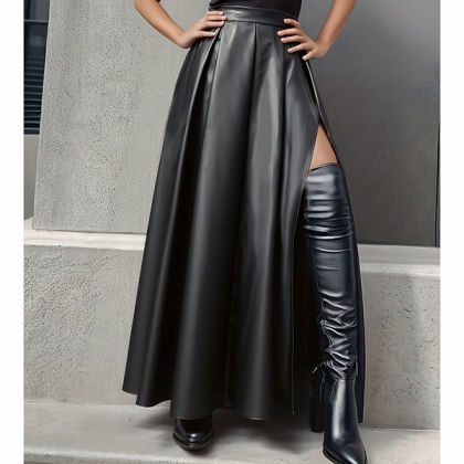 Fashion High-rise Side Slit Artificial Leather PU Maxi Skirt