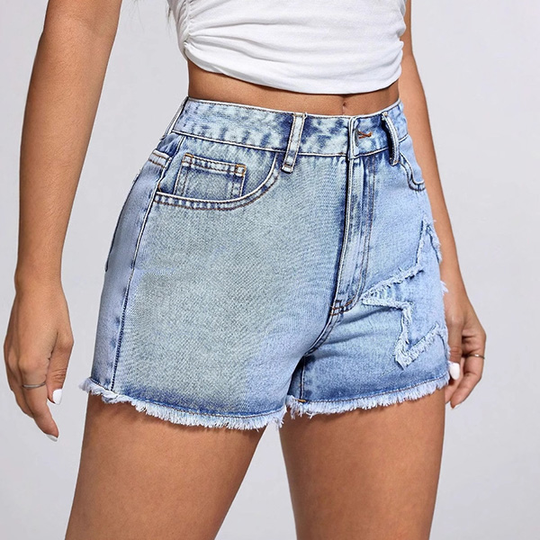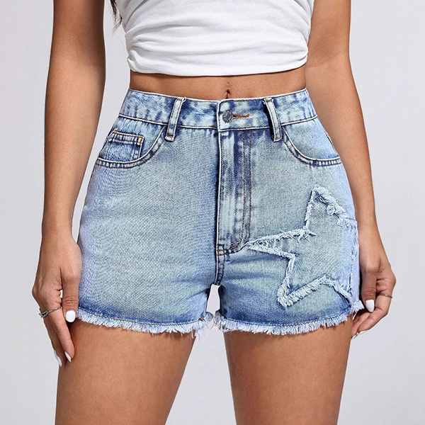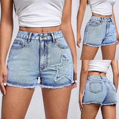 Fashion High-rise Star Pattern Frayed Hemline Old-washed Denim Shorts
