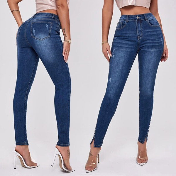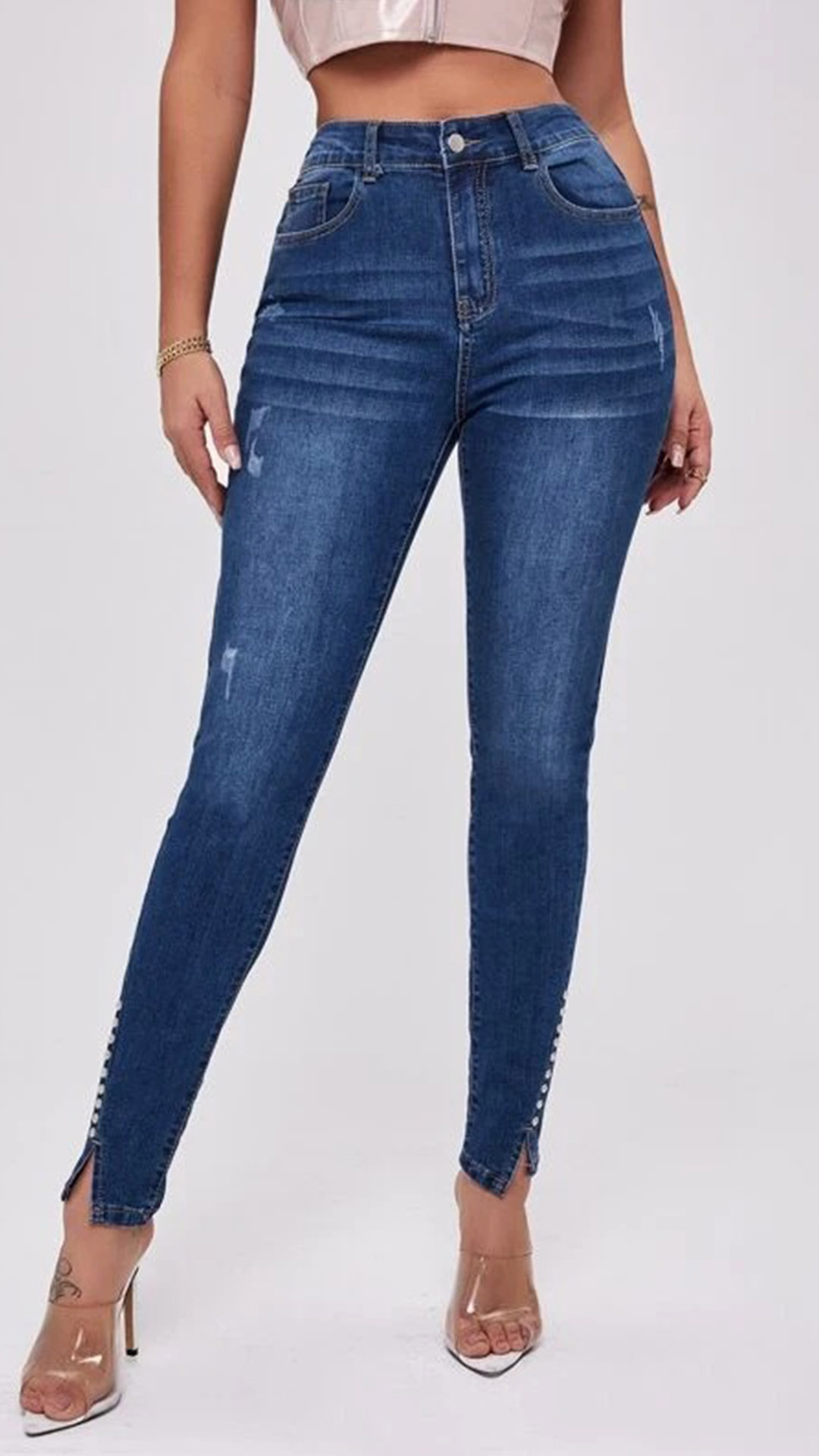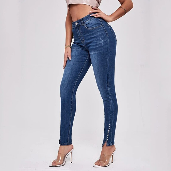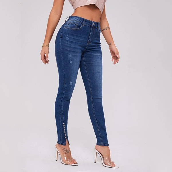 Fashion High Waist Beaded Slit Slim Fit Elastic Denim Jeans