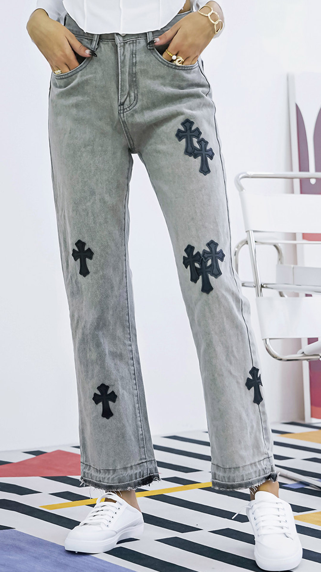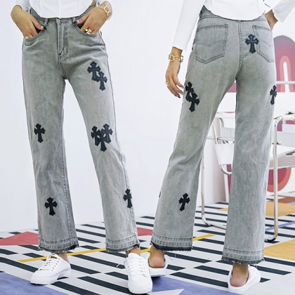 Fashion High Waist Cross Pattern Straight-leg Jeans