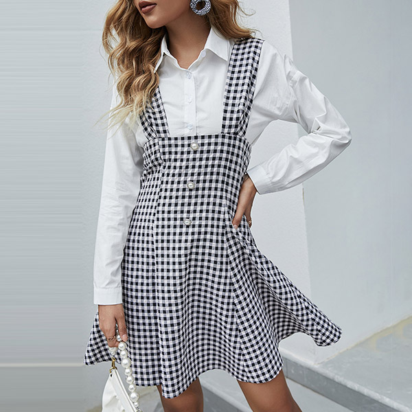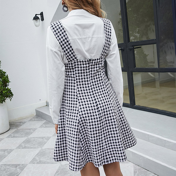 Fashion High Waist Front-button Plaid Suspender Skirt