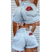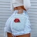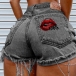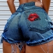 Fashion High Waist Lip Embroidered Frayed Hem Denim Shorts