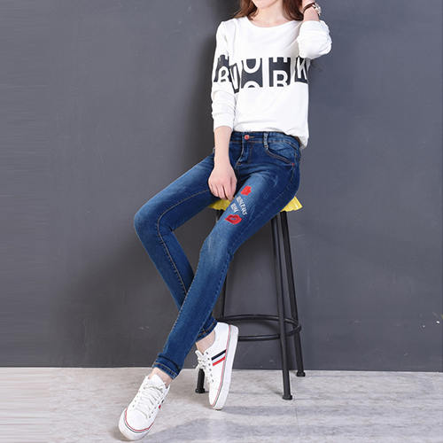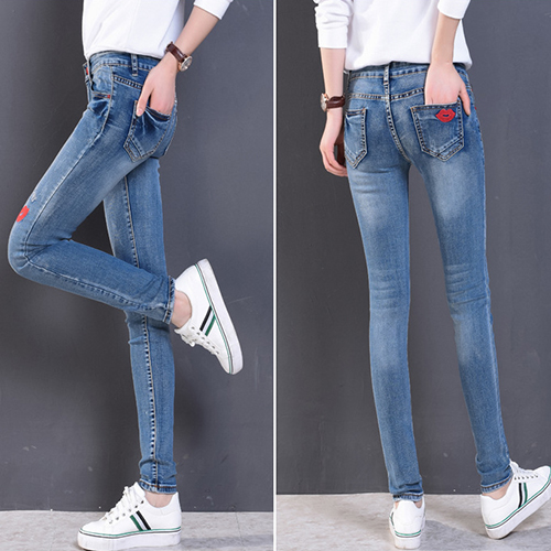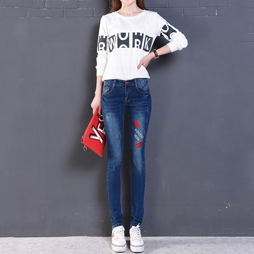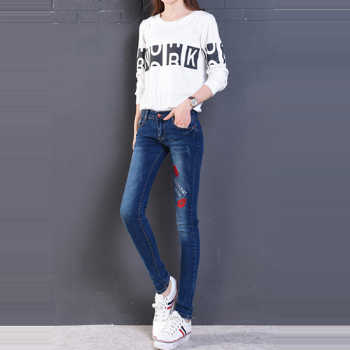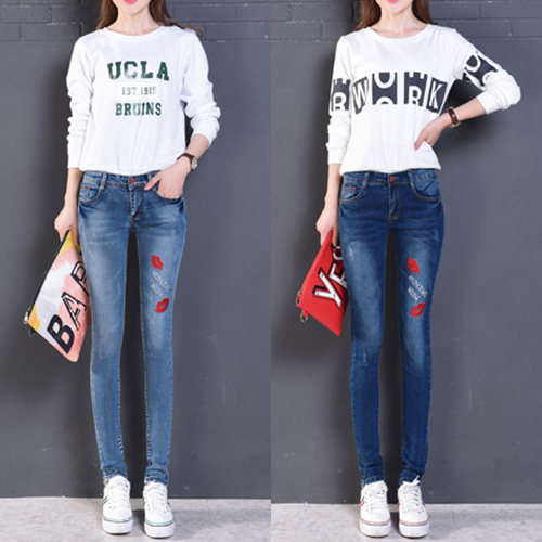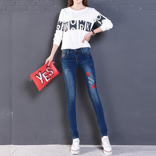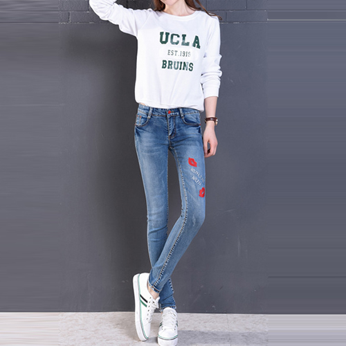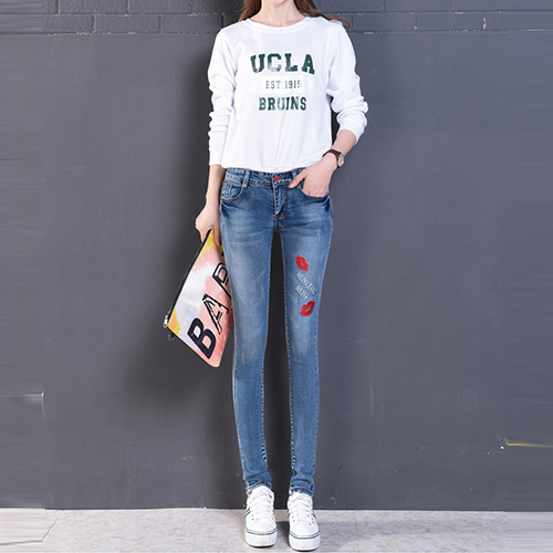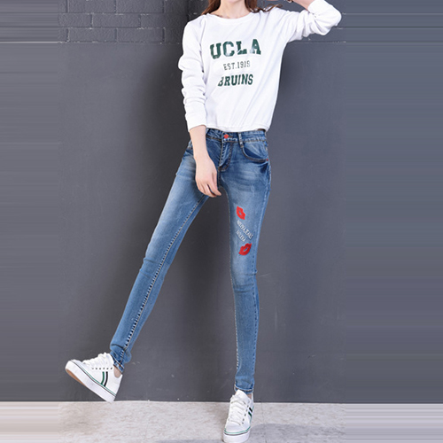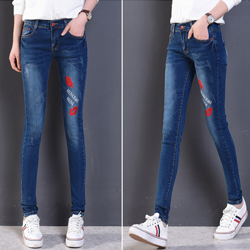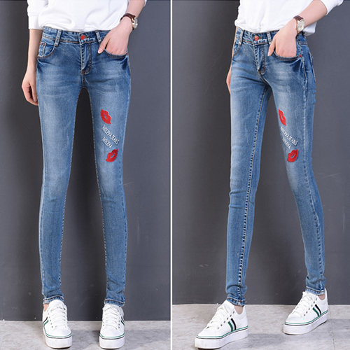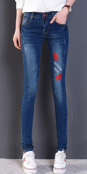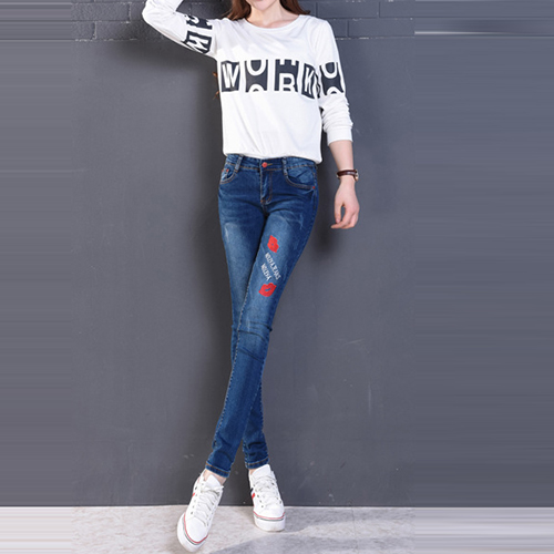 Fashion High Waist Lips Printed Denim Strench Pants