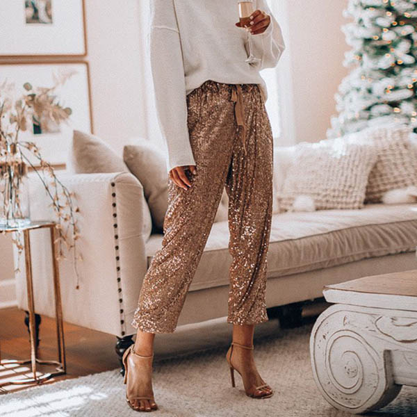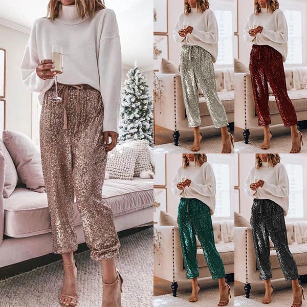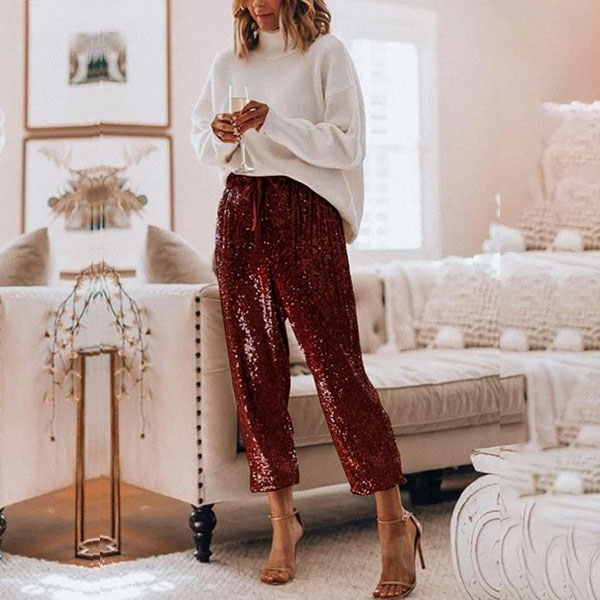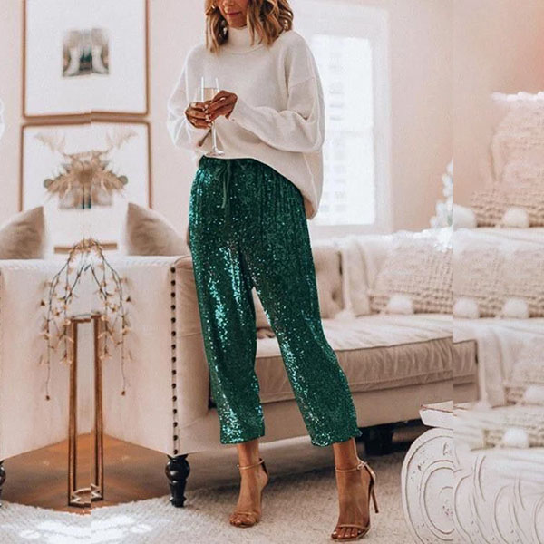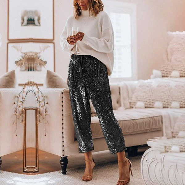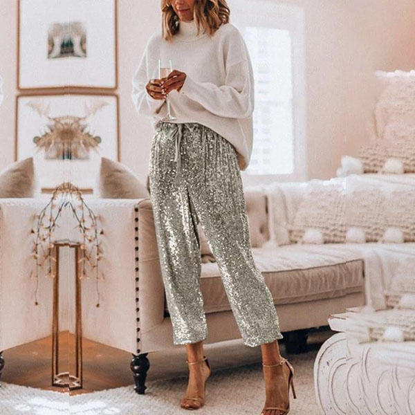 It is a good chance to update your wardrobe with this pants. The sequin design makes it look so shinning and attractive,while the high waist,loose silhouette and breathable fabric can keep you comfy while it showcase your slender figure. We thing matching with a crop top would make you look sexy and charming enough!