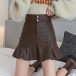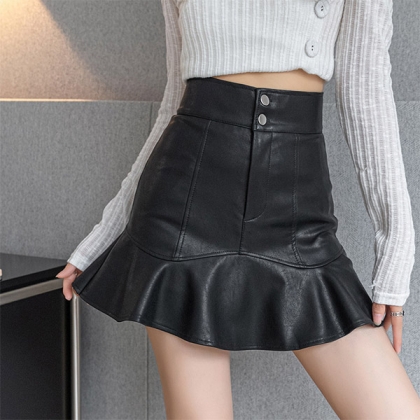 Fashion High Waist Ruffle Hem Slim Fit PU Leather Skirt