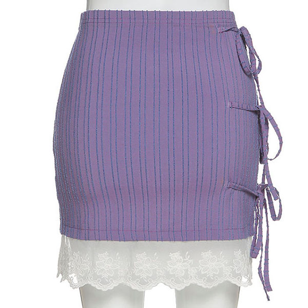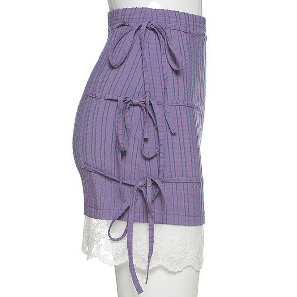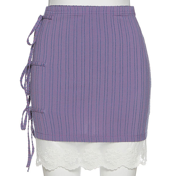 Fashion High Waist Side Lace-up Lace Spliced Hem Striped Skirt