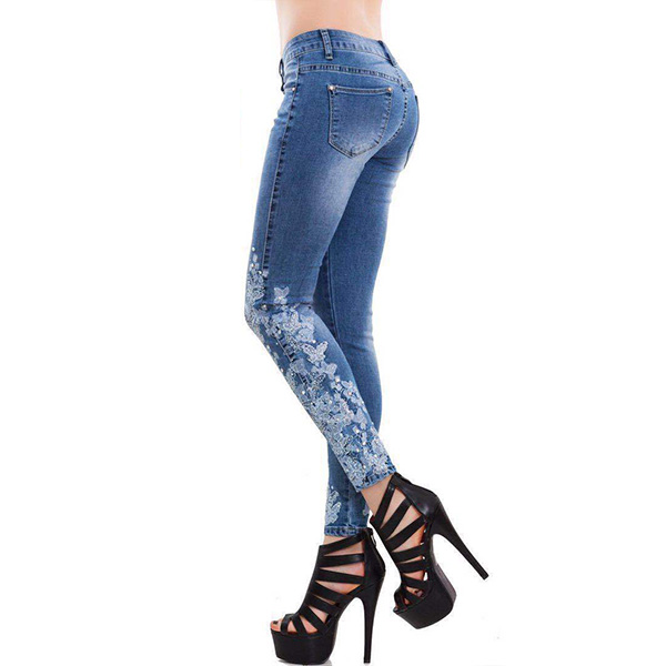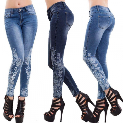 Take interest in this jeans and it will give you an effortless stylish look. The high waist and fit silhouette design can showcase your slender figure,while the lace spliced details will make this piece look more attractive. You can match with a crop top to have a sexy and fashionable look.