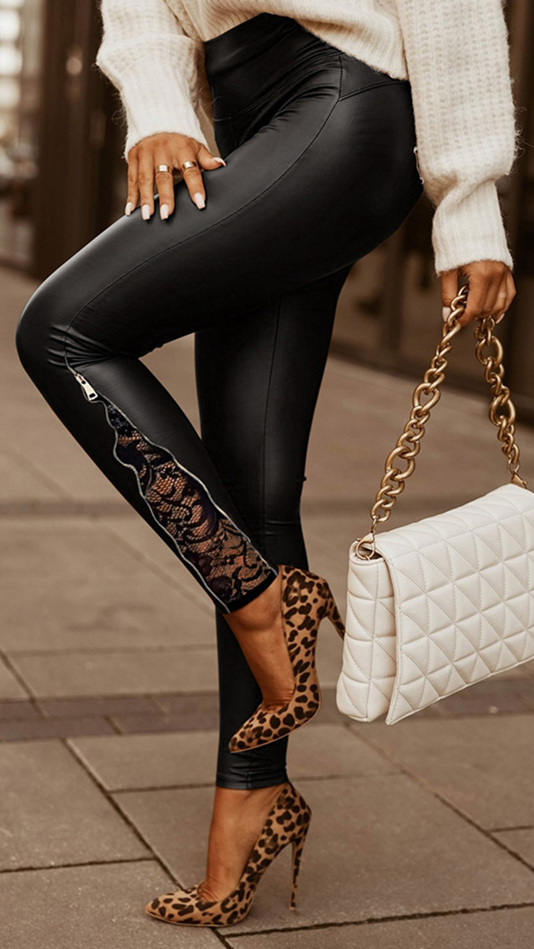 Fashion High Waist Slim Fit Lace Spliced PU Leather Pants