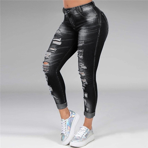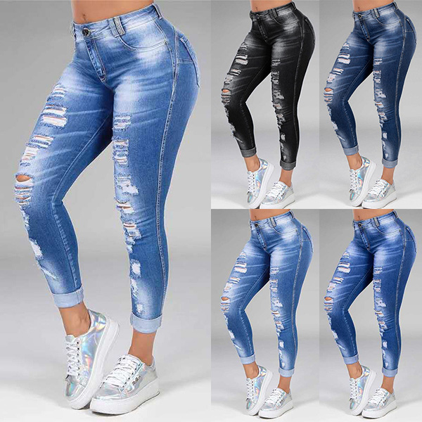 Fashion High Waist Slim Fit Lace Spliced Ripped Jeans