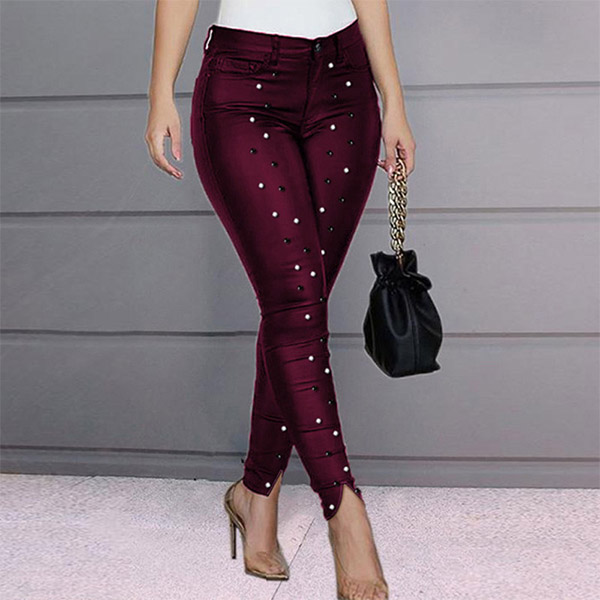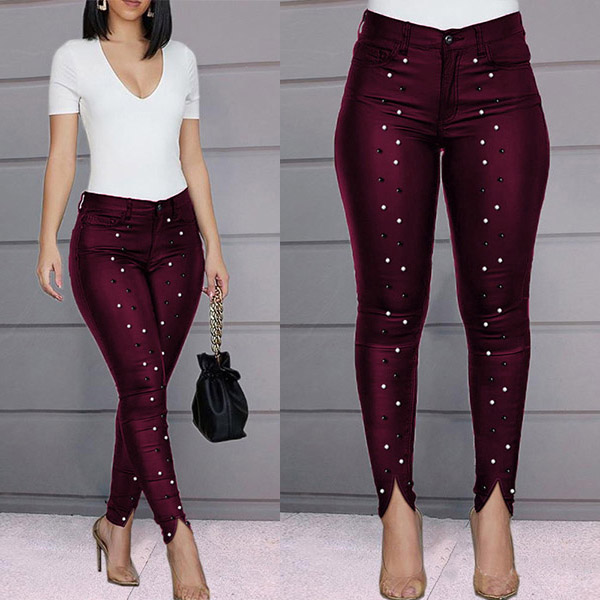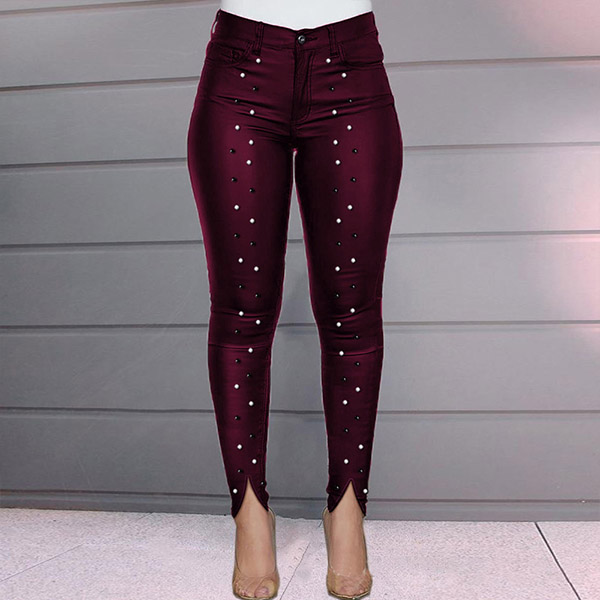 Update your pants ensemble with this wonderful piece. This pants is designed with high waist and a fit silhouette,which can demonstrate your slender legs. The rhinestone details and slit design will make it look more attractive. You can match it with any kind of tops you like to achieve for a charming look.