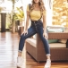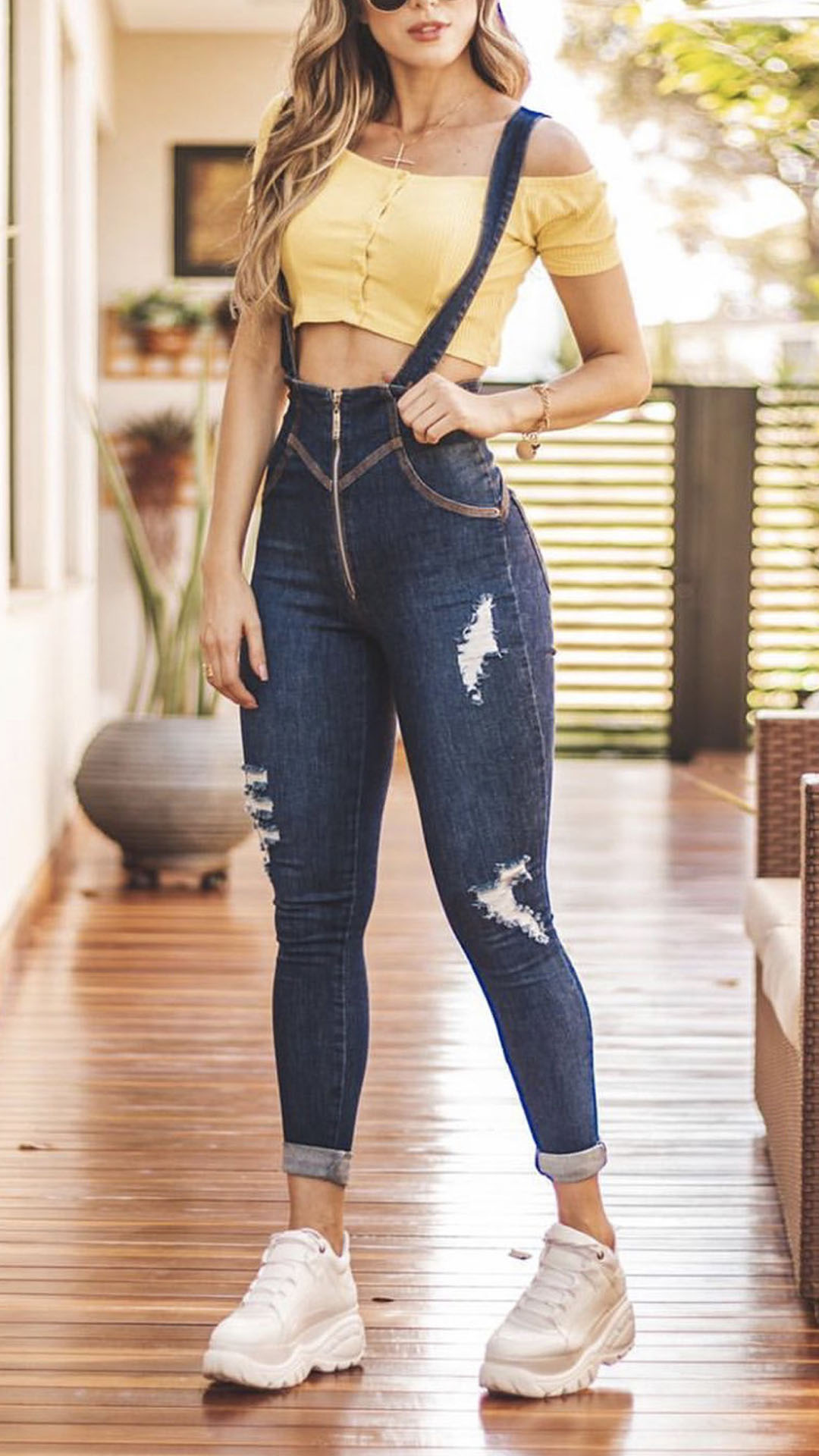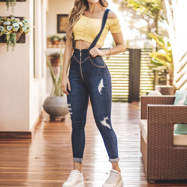 As for a playful and youthful daily style,you can just turn to this denim overalls for help. The high waist and fit silhouette design can showcase your slender figure,while the ripped details will add some extra charm. You can match with a simple t-shirt or shirt to start your wonderful day.