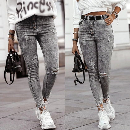 As a wardrobe essential,you need such a stylish and all-match jeans, The high waist and fit silhouette design can showcase your slender figure,while the ripped details will make this piece look more stylish and attractive. No matter what kind of tops you pair with,it can hardly go wrong!