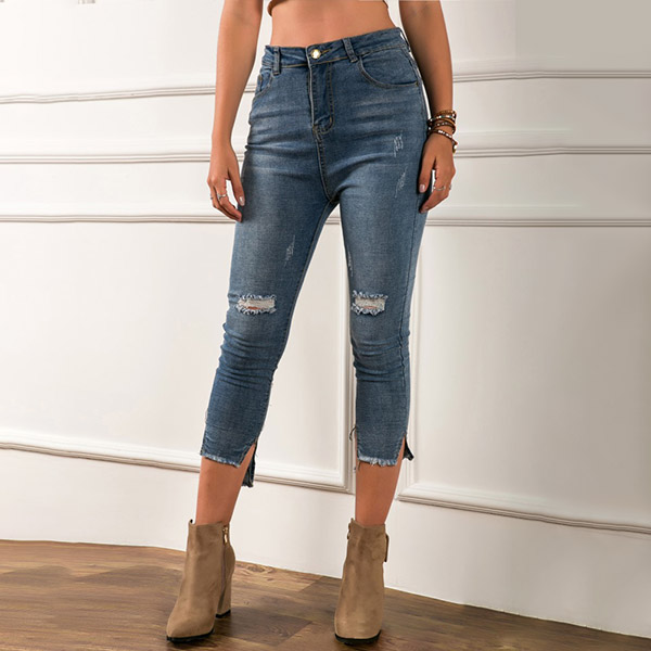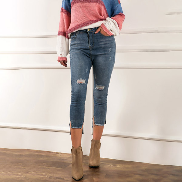 Fashion High Waist Slim Fit Ripped Slit Hem Ankle-length Jeans