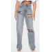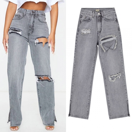 Fashion High Waist Slit Hem Hollow Out Ripped Straight-leg Jeans
