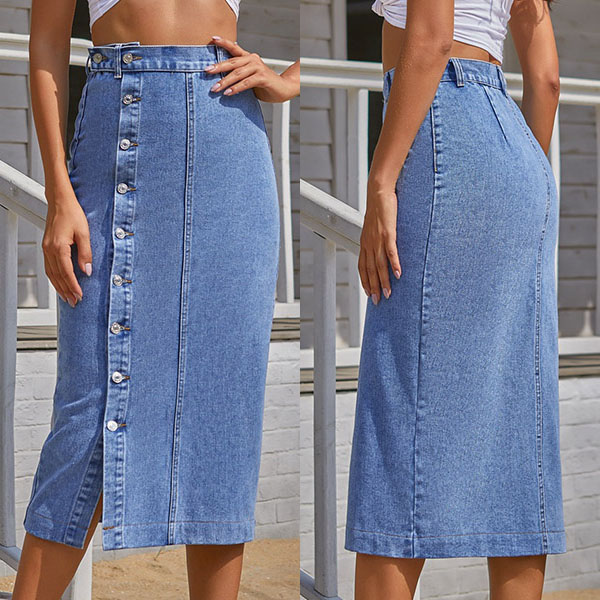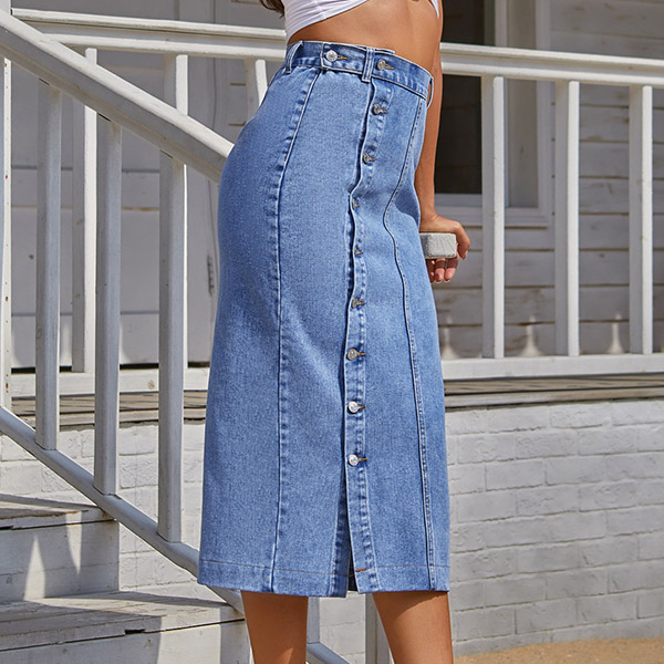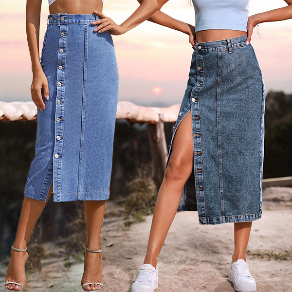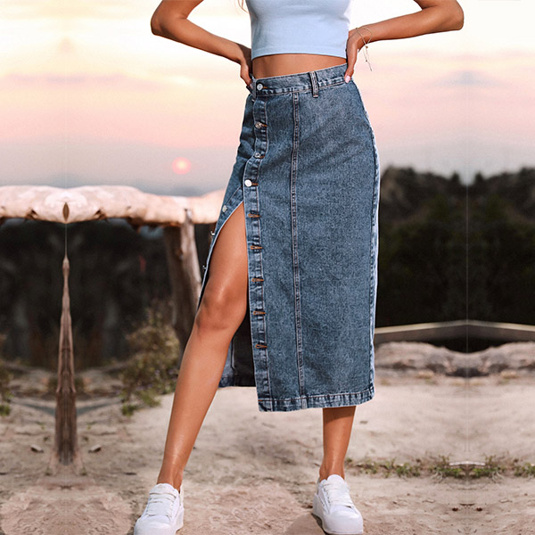 It is a good chance for you to update your daily style and boost your entire charm with the help of this denim skirt. The high waist,slit hem and fit silhouette design can better showcase your slender figure and legs,while the front-button details will further enhance its charm. You can just match with a crop top to start your wonderful day!