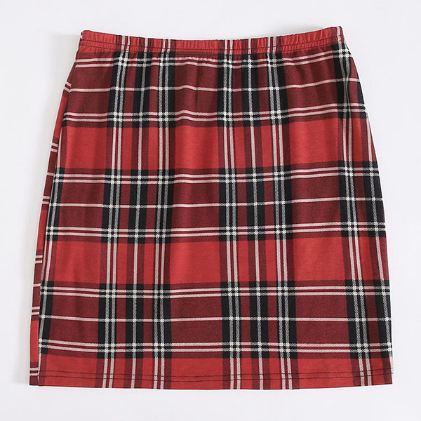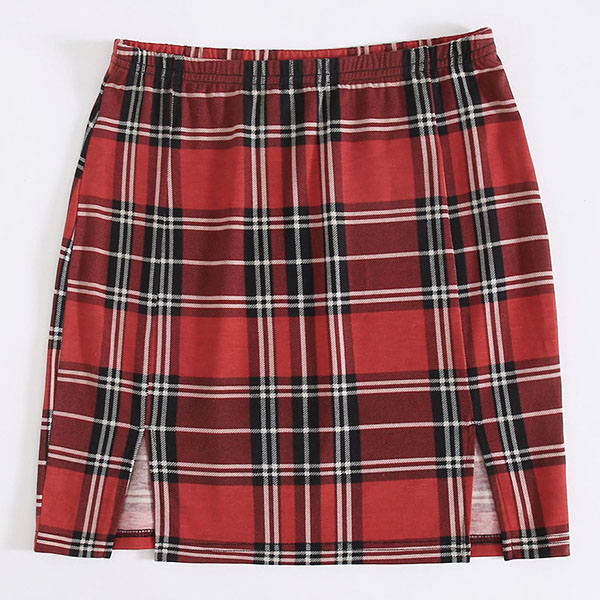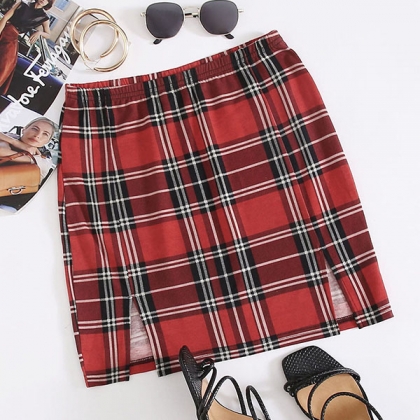 Fashion High Waist Slit Hem Slim Fit Plaid Skirt