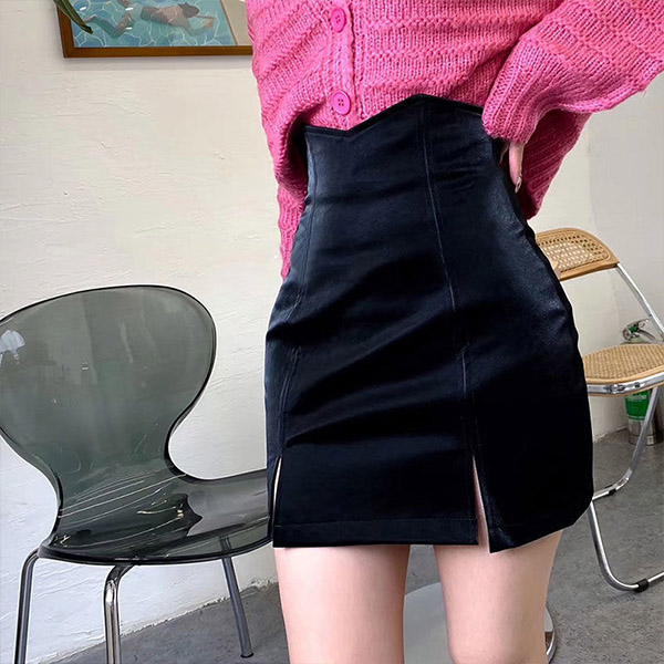 Fashion High Waist Slit Hem Slim Fit PU Leather Skirt
