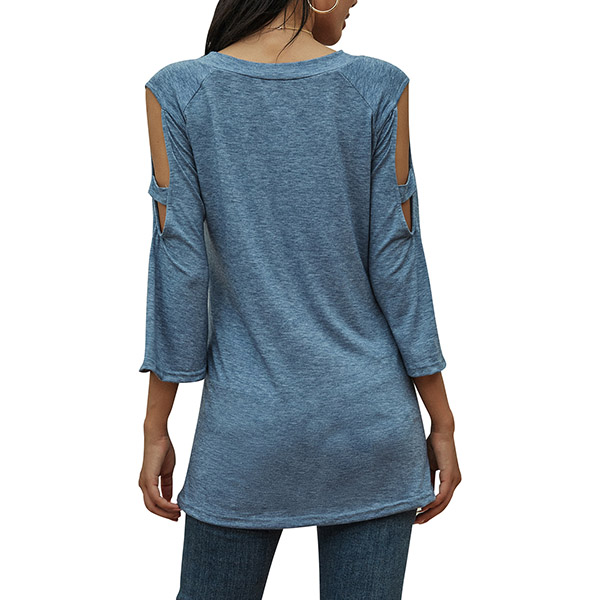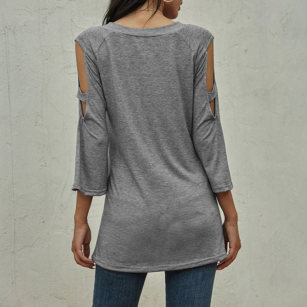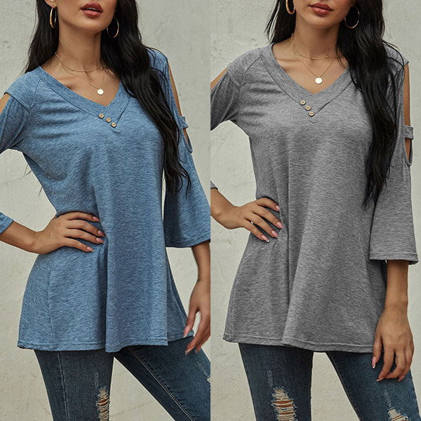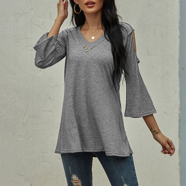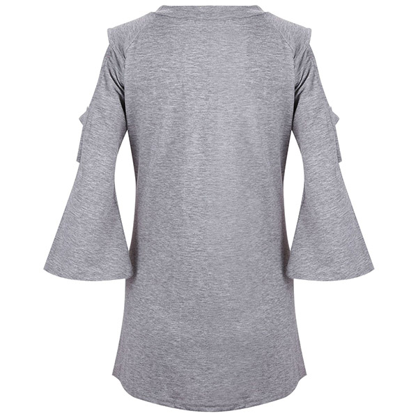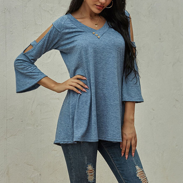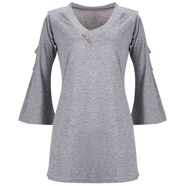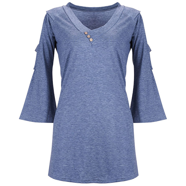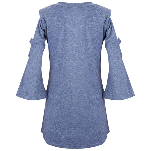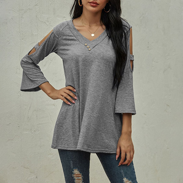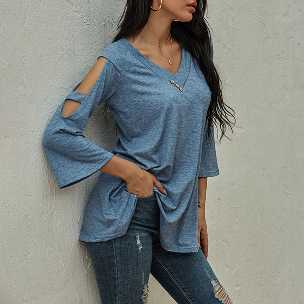 This t-shirt that exudes chic and stylish sense is worth to arouse your attention. Solid color style,the 3/4 trumpet sleeve,v-neck and hollow out design make this piece look so distinctive and attractive. Your style can have a boost when you wear this piece.
