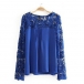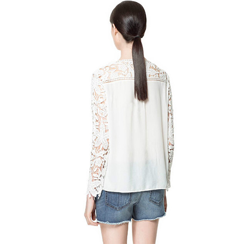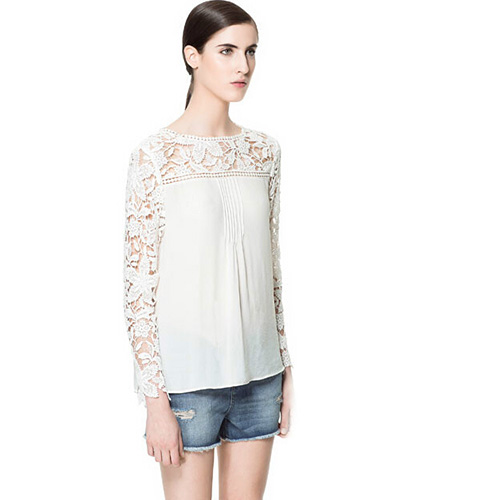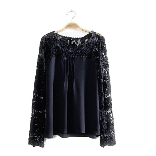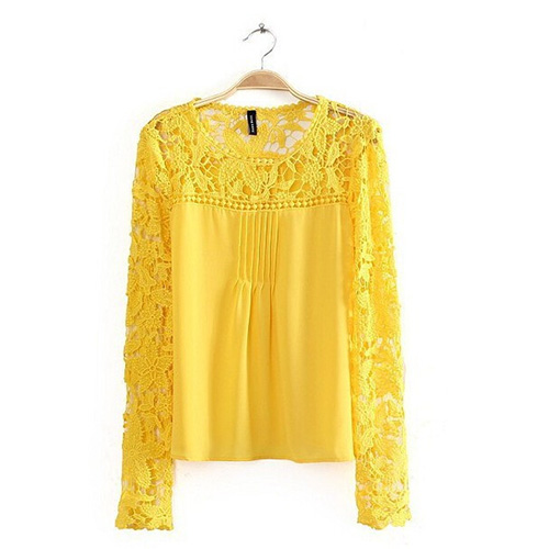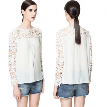 Combination chiffon and lace,shows its elegant temperament and feminine. Shoulder and sleeve part with hollow out crochet lace spliced design. Fashion round neck and loose design. Perfect for matching jeans.