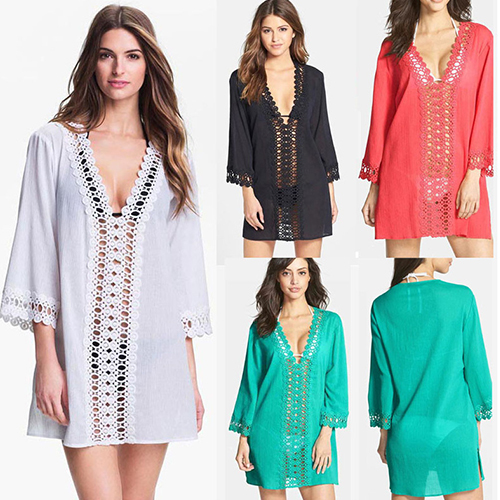 Fashion Hollow Out Lace Spliced 3/4 Sleeve Beach Dress Smock