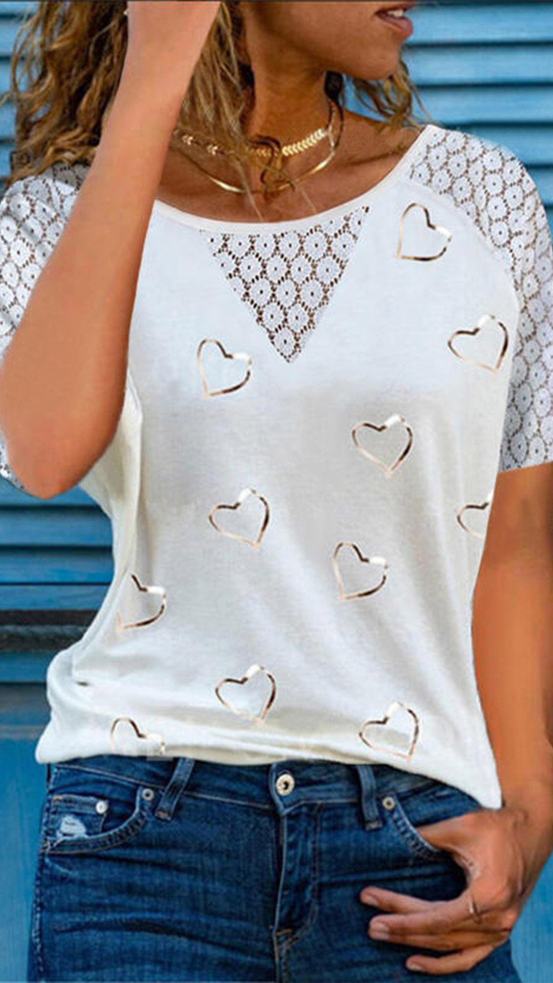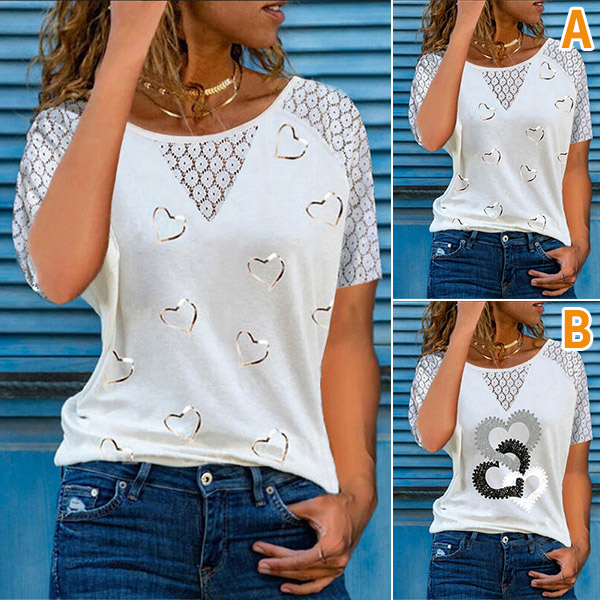 Embrace your casual weekends with a relaxed piece such as this t-shirt. The hollow out lace spliced details and heart printed pattern deign make this piece look more stylish and attractive. Finished with short sleeve,round neck and a loose silhouette,this t-shirt is a perfect addition for a casual and fashionable daily look.