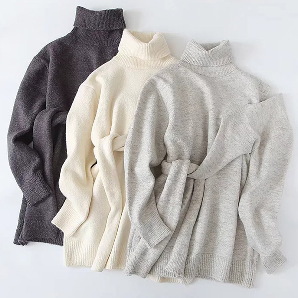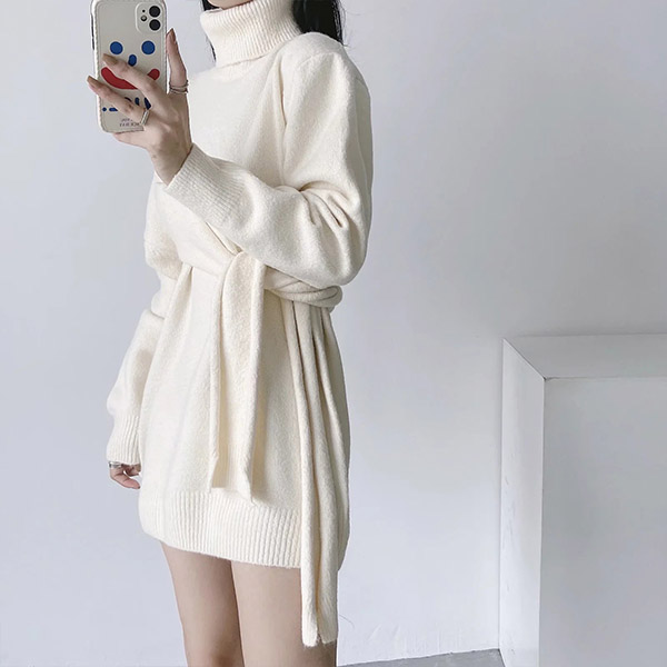 Fashion Hollow Out Long Sleeve Turtleneck Solid Color Lace-up Sweater Dress