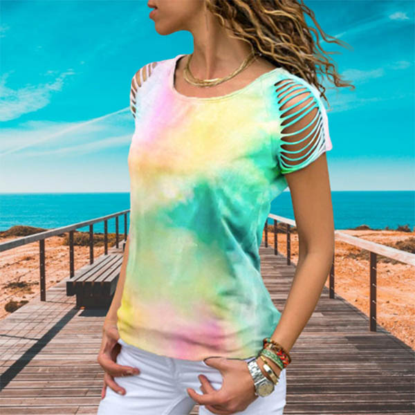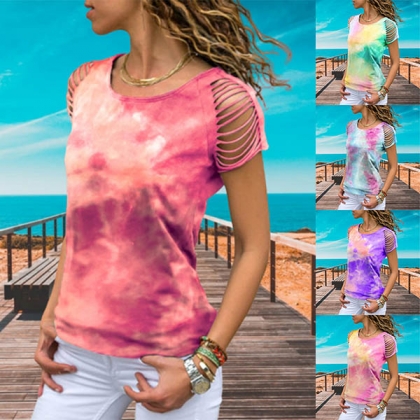 Fashion Hollow Out Short Sleeve Tie-dye Printed T-shirt