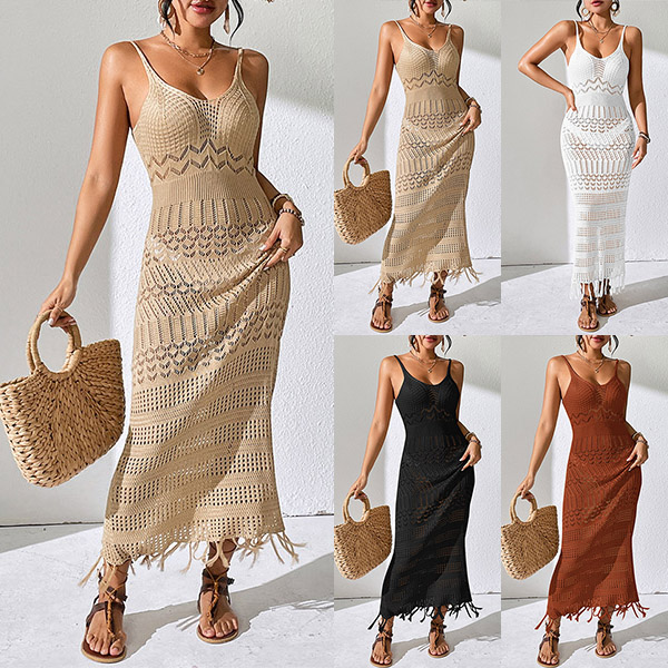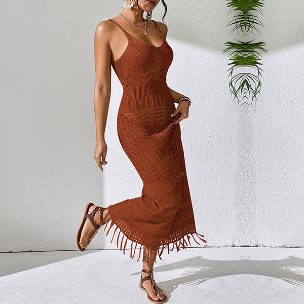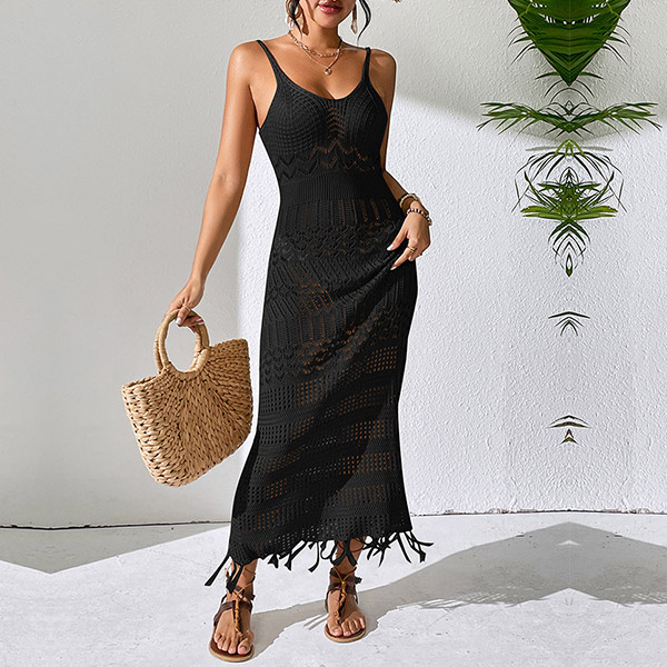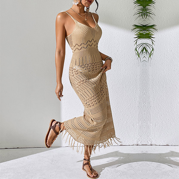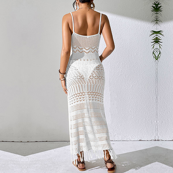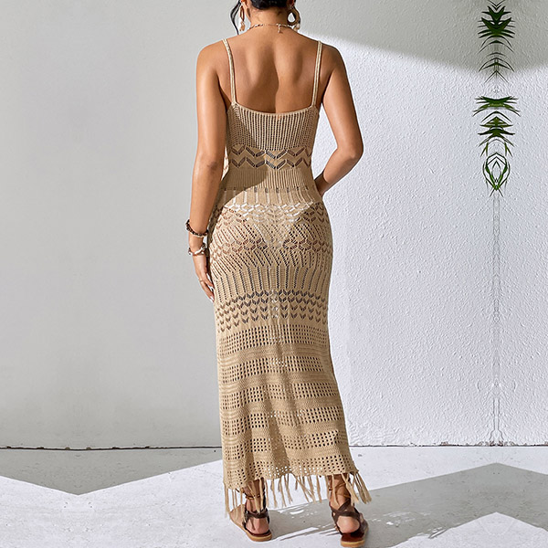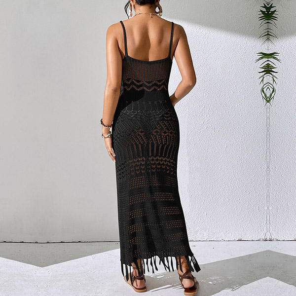 Fashion Hollow Out V-neck Sleeveless Tassel Cami Maxi Dress