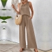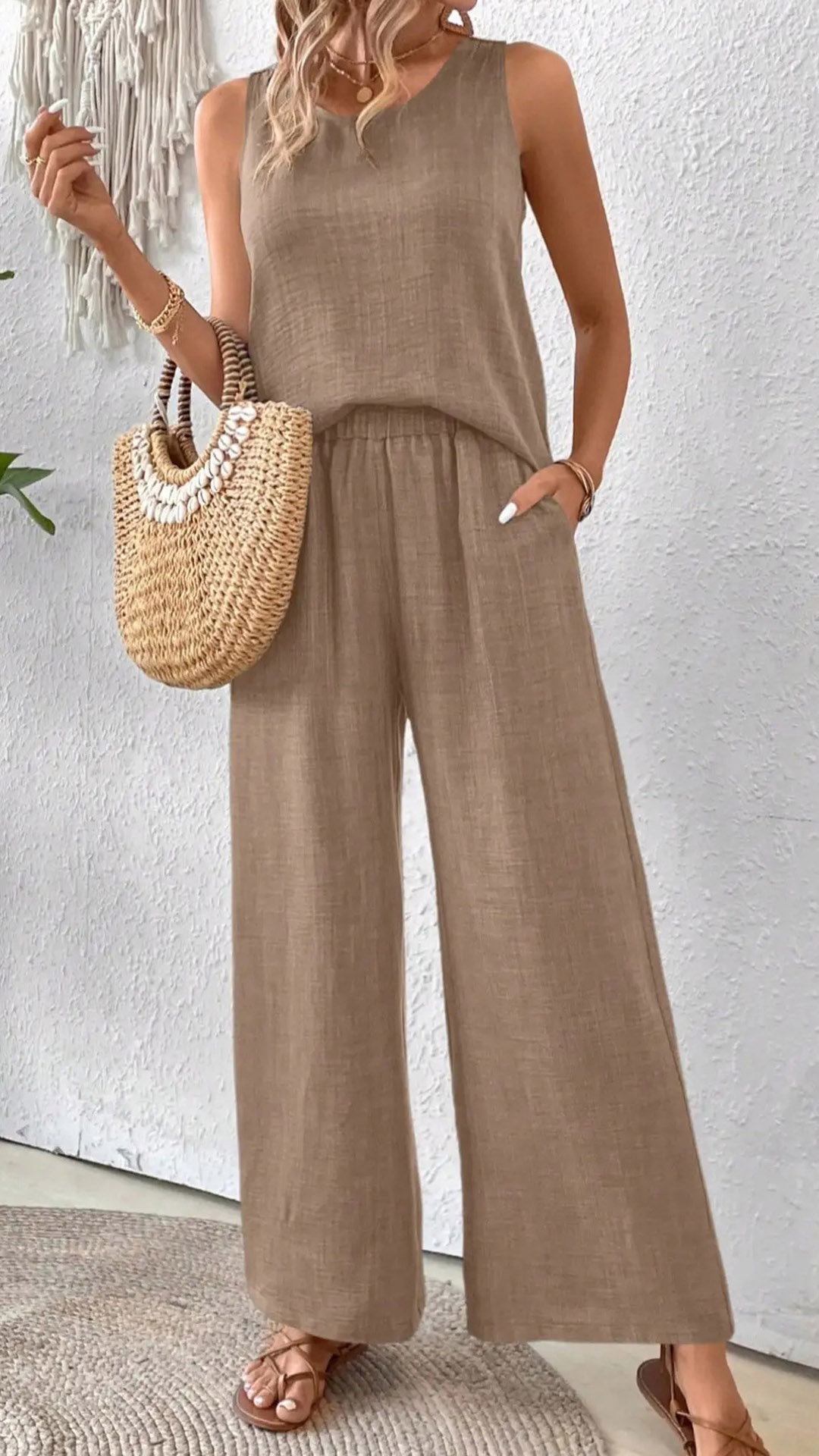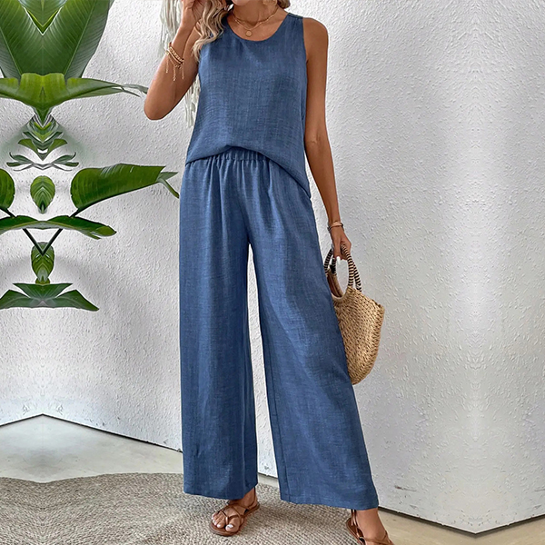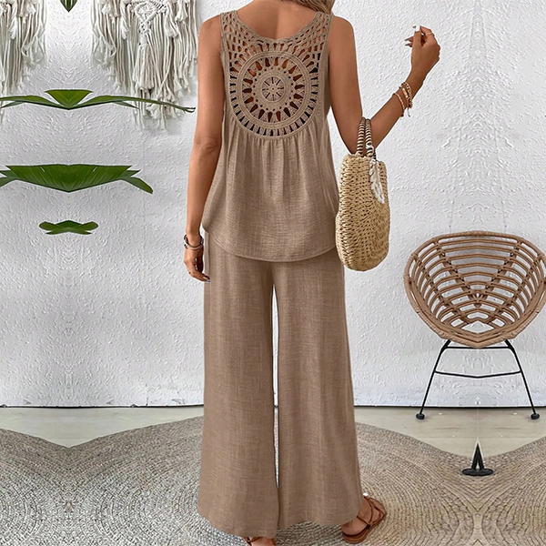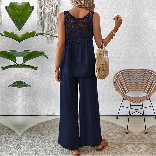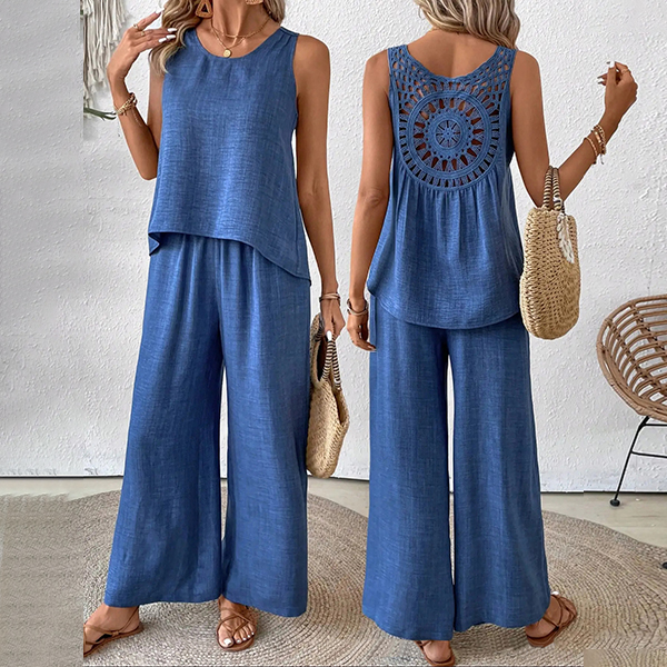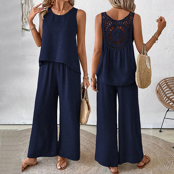 This fashionable two-piece set features a hollow-out design and consists of a sleeveless shirt and straight-cut pants, creating a leisure and stylish look. Wanna have a try?