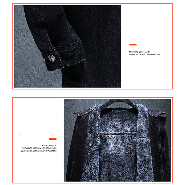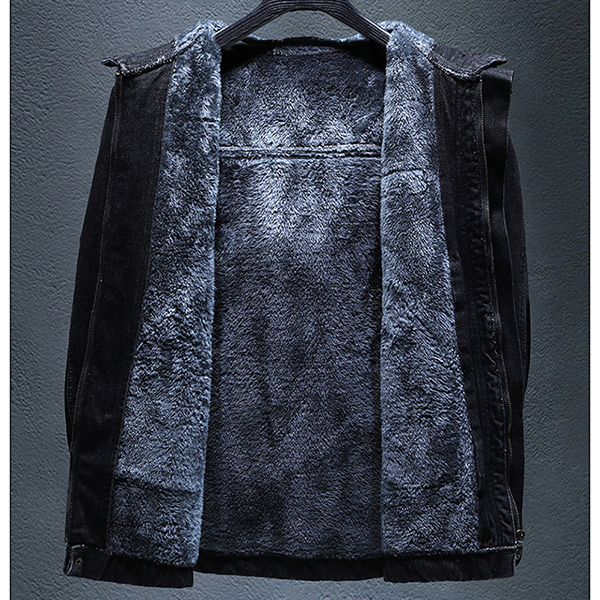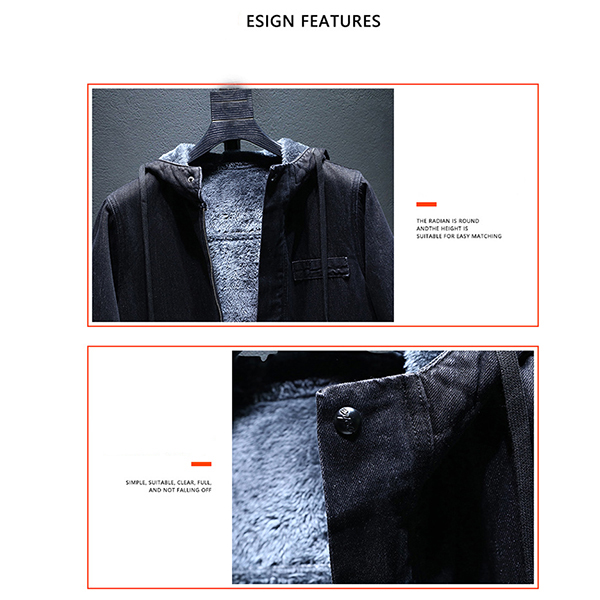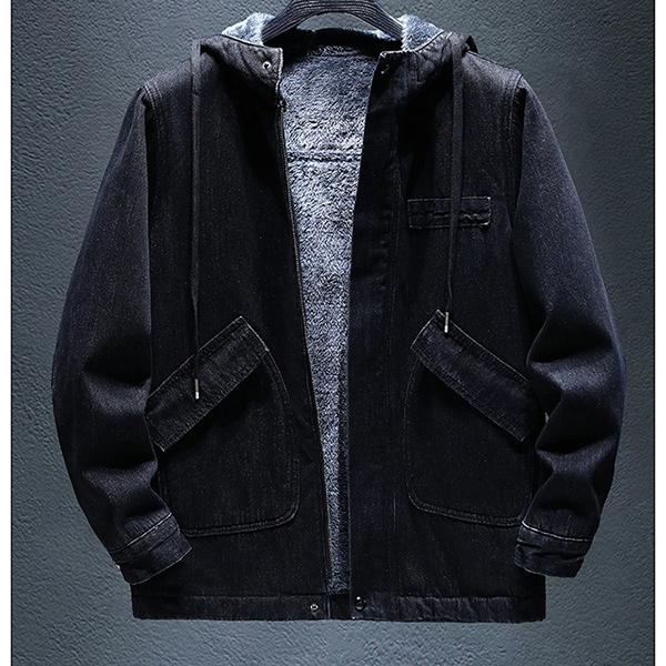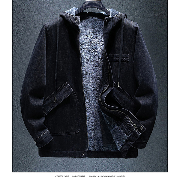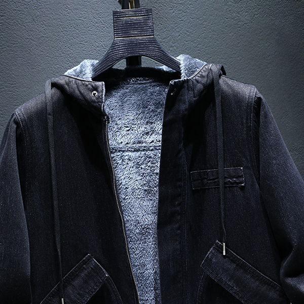 Fashion Hooded Long Sleeve Warm Plush Lined Old-washed Denim Jacket for Men