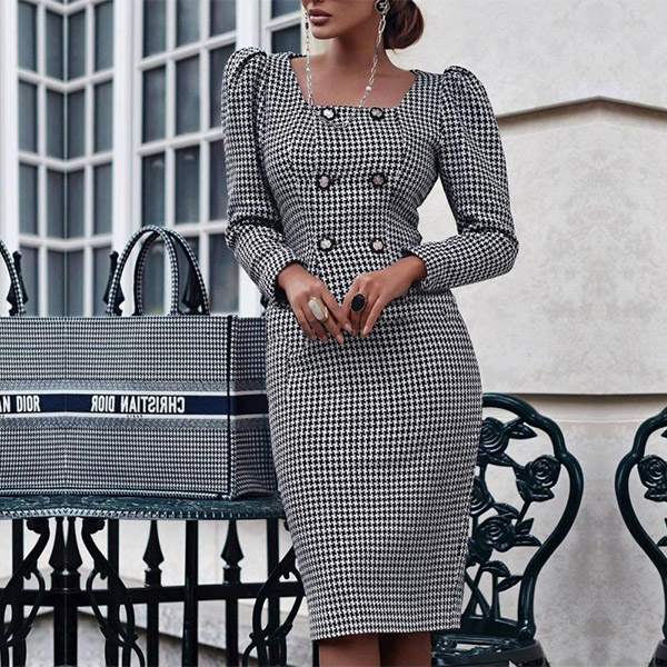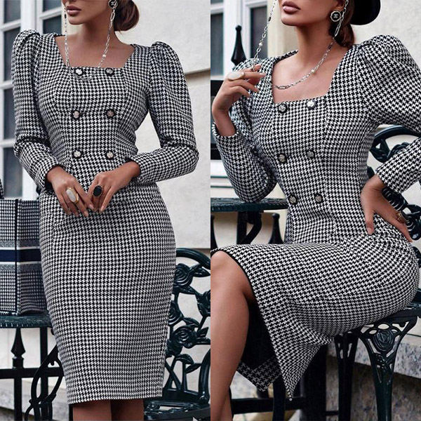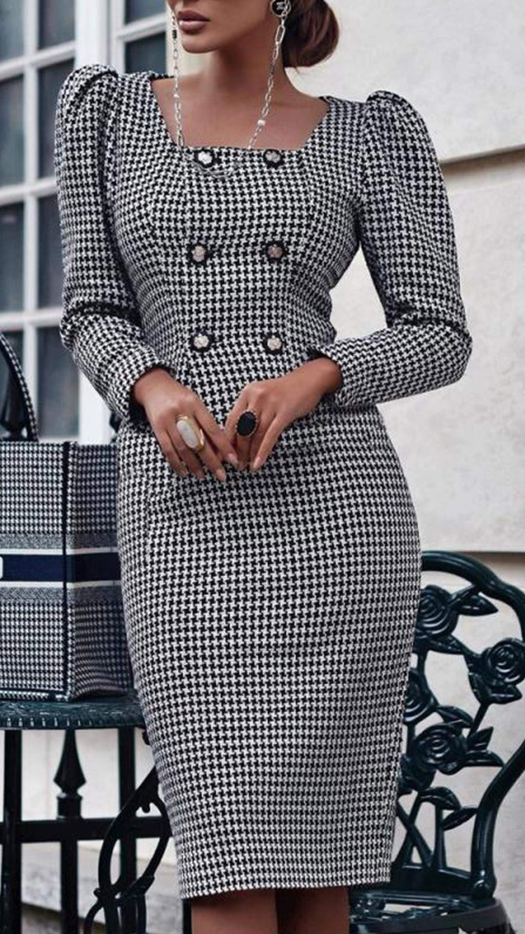 How about this dress? The houndstooth print is eye-catching and stylish, and the puff sleeves add a touch of elegance. The bodycon silhouette is figure-flattering and sexy, and the double-breasted design is both unique and stylish. This dress is sure to turn heads wherever you go!