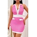 This bodycon dress features a classic houndstooth print, a button-up V-neckline, and a sleeveless design, creating a chic and sophisticated look. Is it your style?