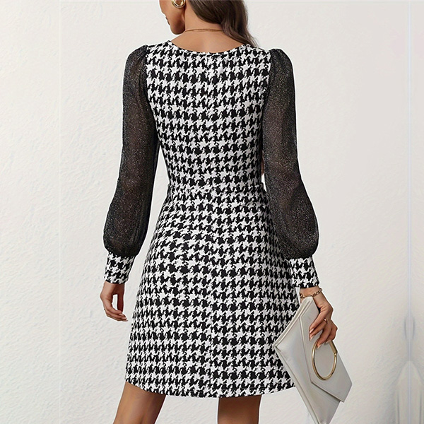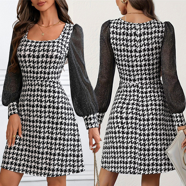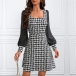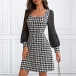 Fashion Houndstooth Printed Gauze Spliced Long Sleeve Square Neck Mini Dress