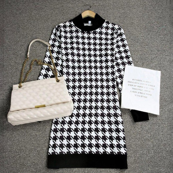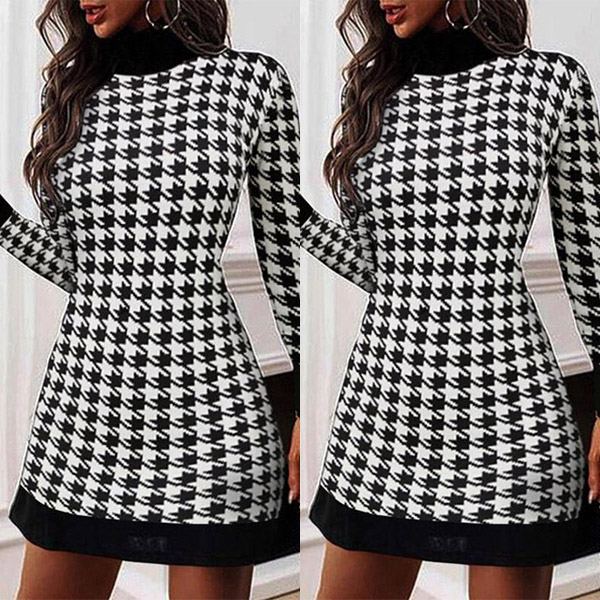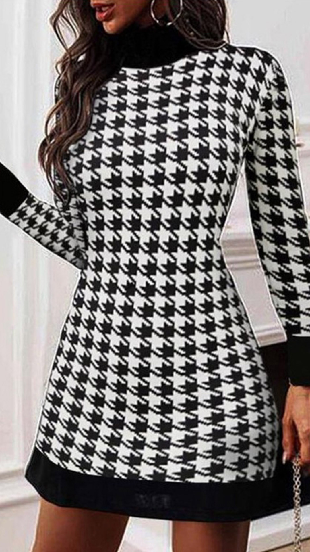 Fashion Houndstooth Printed Mock Neck Long Sleeve Bodycon Dress