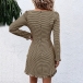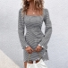 Fashion Houndstooth Printed Square Neck Long Sleeve Frayed Irregular Hemline Bodycon Dress