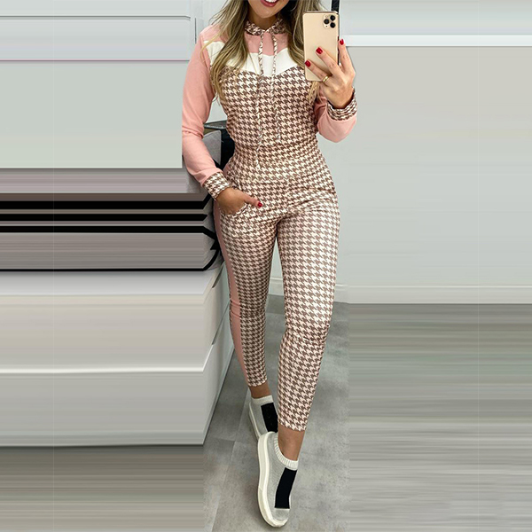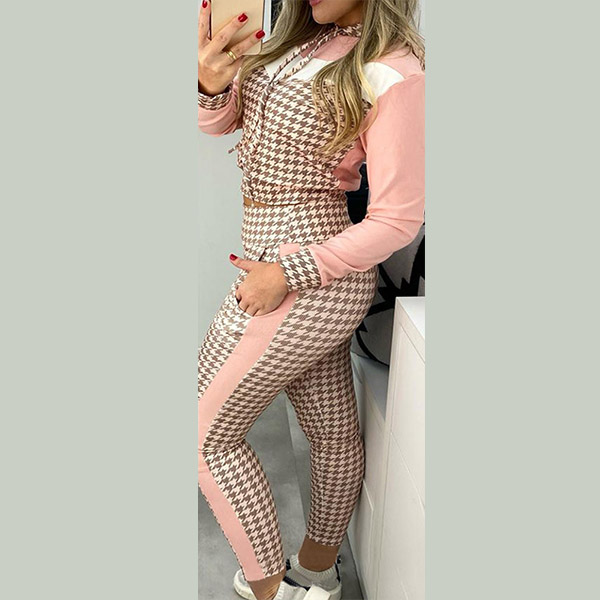 Fashion Houndstooth Spliced Long Sleeve Round Neck Sweatshirt + Pants Two-piece Set