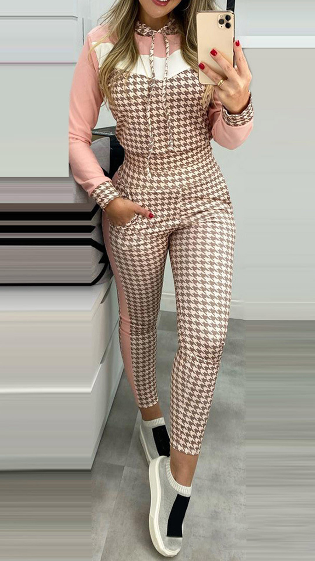 When you have no time for your daily matching,then you can make your eyes focused on this two-piece set. The houndstooth printed details make it look so stylish and attractive. Including a long sleeve round neck sweatshirt and a pants,crafted from soft,breathable fabric,this two-piece set is sure to give you a laid-back and fashionable daily look.