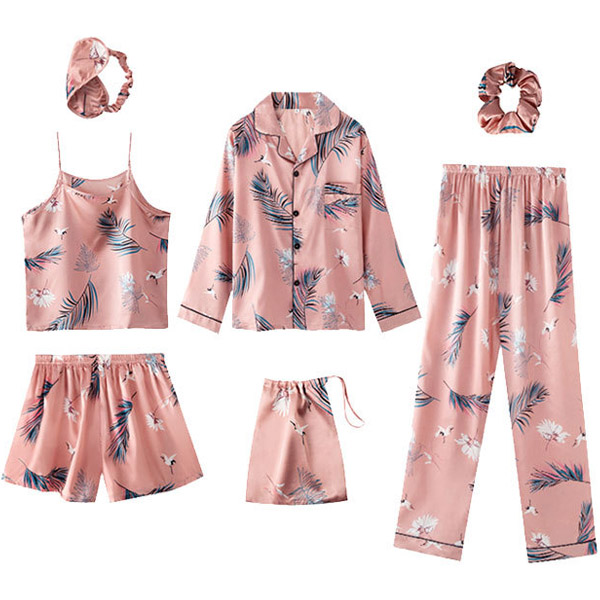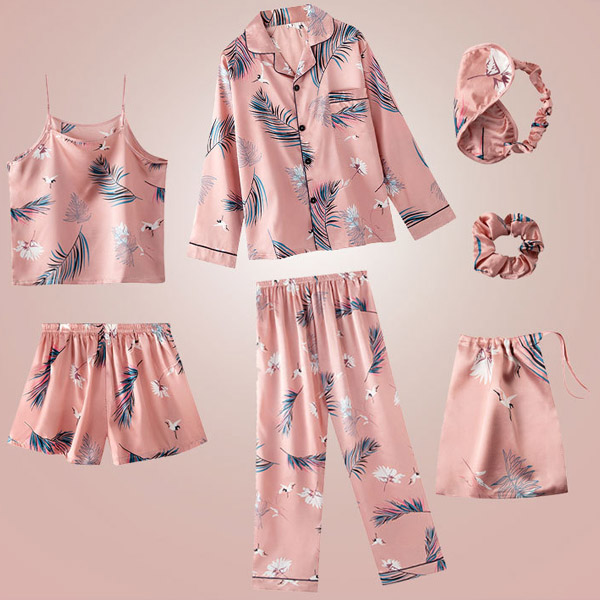 Crafted from super soft,smooth imitation silk fabric,which can offer you an utmost comfort. And the chic printed details will make it look more stylish and attractive. Including a long sleeve top,a pants,a shorts,a sling top,a eye mask,a hair ring and a storage bag,this seven-piece home-wear set is perfect fit for different seasons.