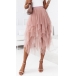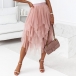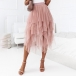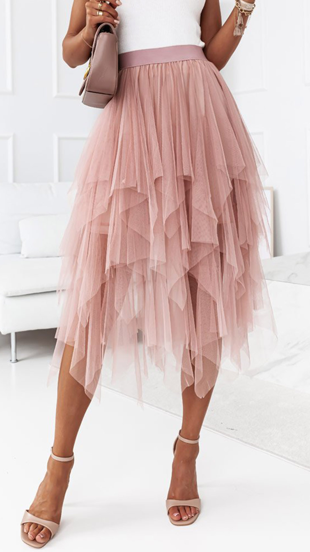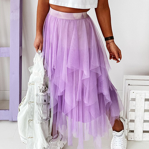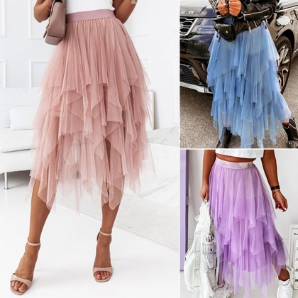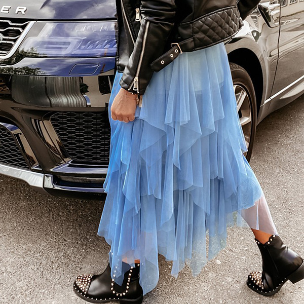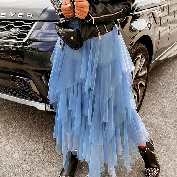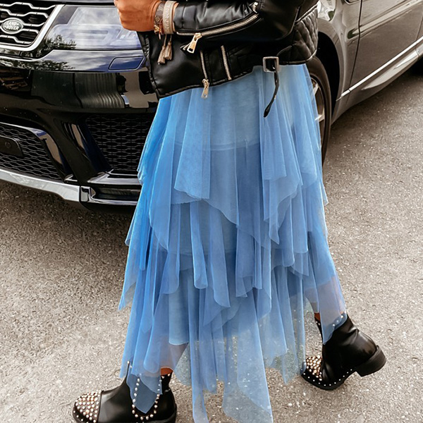 This fashion-forward skirt features an irregular hemline and a gauze fabric, giving it a unique and edgy look. The flowing fabric and asymmetrical hemline create a sense of movement and add a touch of drama to your outfit. This versatile skirt is a statement piece that will elevate any outfit.