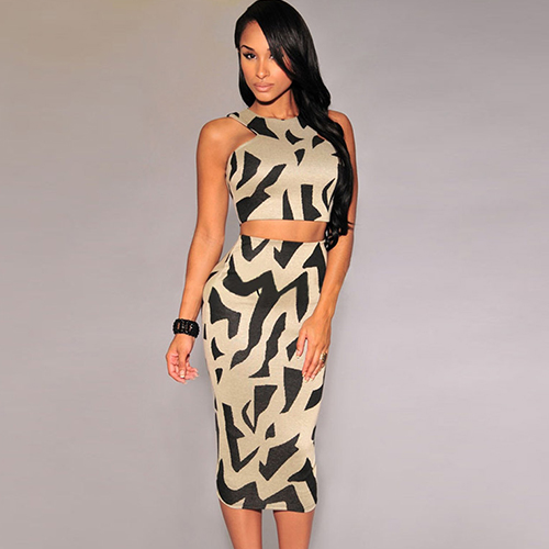 Two-piece style,with irregular print pattern,chic and stylish. Tops with sleeveless and round neck design;