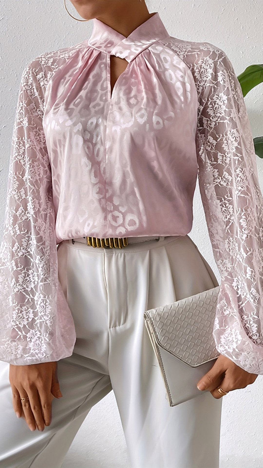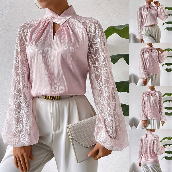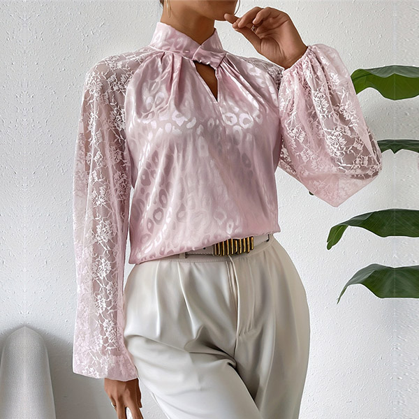 This trendy shirt features a bold leopard print combined with intricate jacquard lace splicing along the sleeve for a chic and sophisticated look. The front cut-out detail add a touch of allure, making it perfect for both casual outings and dressy occasions. Pair it with high-waisted jeans, leather pants, or skirts for a confident, fashion-forward ensemble.