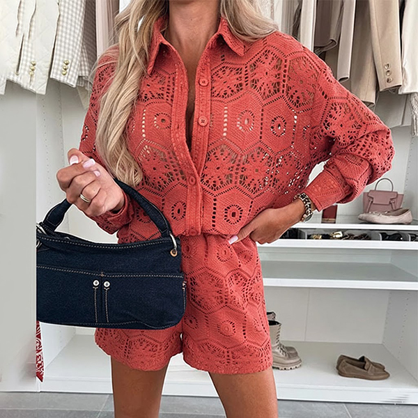 This lace set features intricate jacquard pattern with delicate lace construction for contemporary coordinated elegance. The lace blouse provides romantic texture with feminine appeal whilst the matching lace shorts create playful proportions and cohesive styling sophistication. Multi-colors avabile.